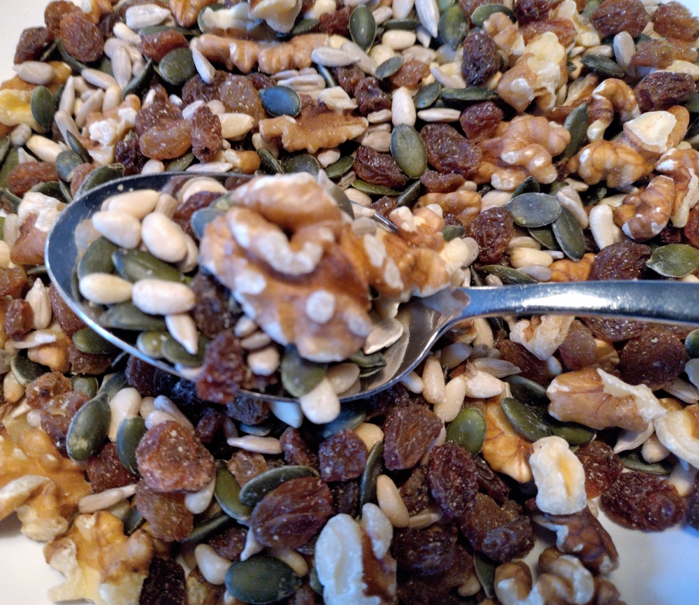 Sultaninen, Walnüsse, Sonnenblumenkerne, Kürbiskerne und Pinienkerne.
