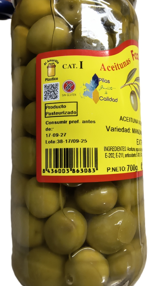 Grüne Oliven, Wasser , Salz, PH Regulator E-270, E-330, Konservierungsstoffe E-202, E-211, Antioxidanzien E-300
